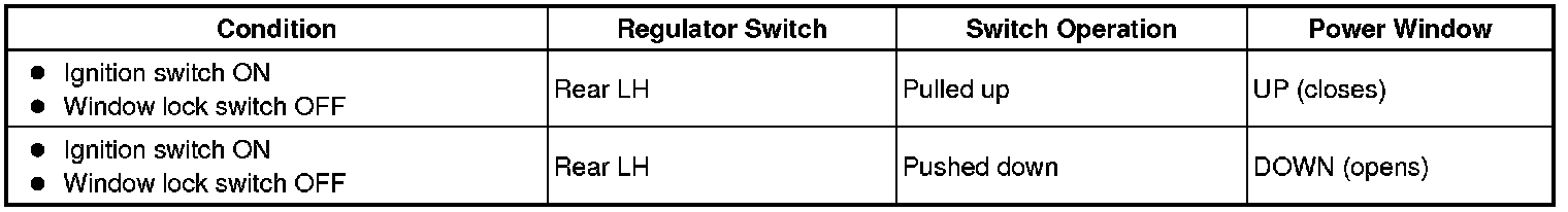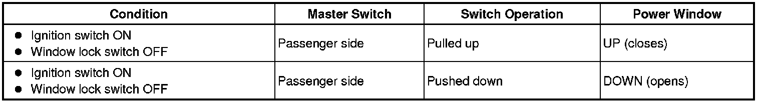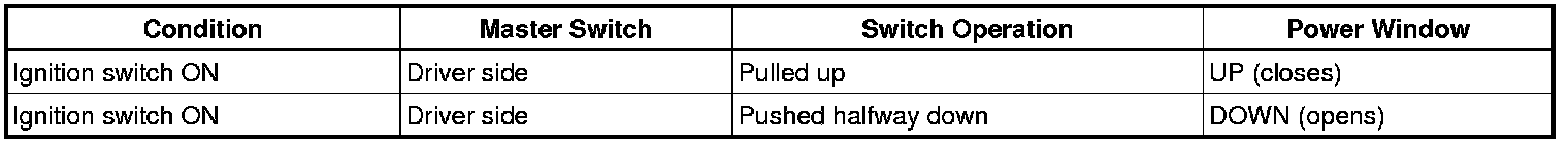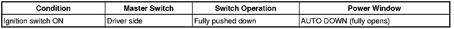 HINT: PTC operation is a function that prevents overloading of the power window regulator by stopping the motor. PTC operation activates when the power window switch is operated for a predetermined amount of time.
