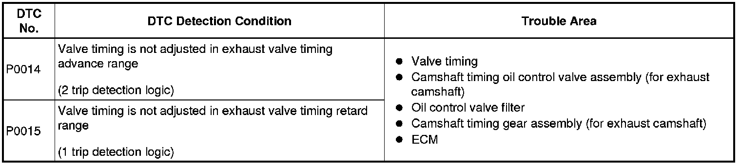 HINT: DTC P0014 or P0015 is stored when foreign objects in engine oil are caught in some part of the system. These codes will remain stored for a short time even after the system returns to normal. These foreign objects may then be captured by the oil filter, thus eliminating the source of the problem.