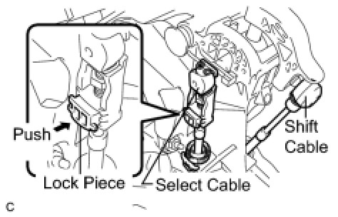 (c) Push the two claws together at the top of the transmission control cable lock piece. While holding the two claws together, push the two lugs on the bottom of the lock piece toward each other and upward to pull out the lock piece.