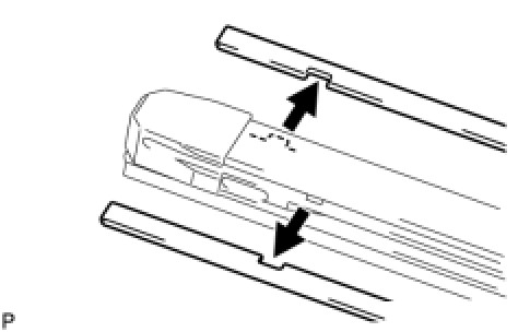 (b) Install the wiper rubber and the 2 wiper rubber backing plates to the front wiper blade with the tip of the rubber (curved end) facing the axis of the wiper arm.