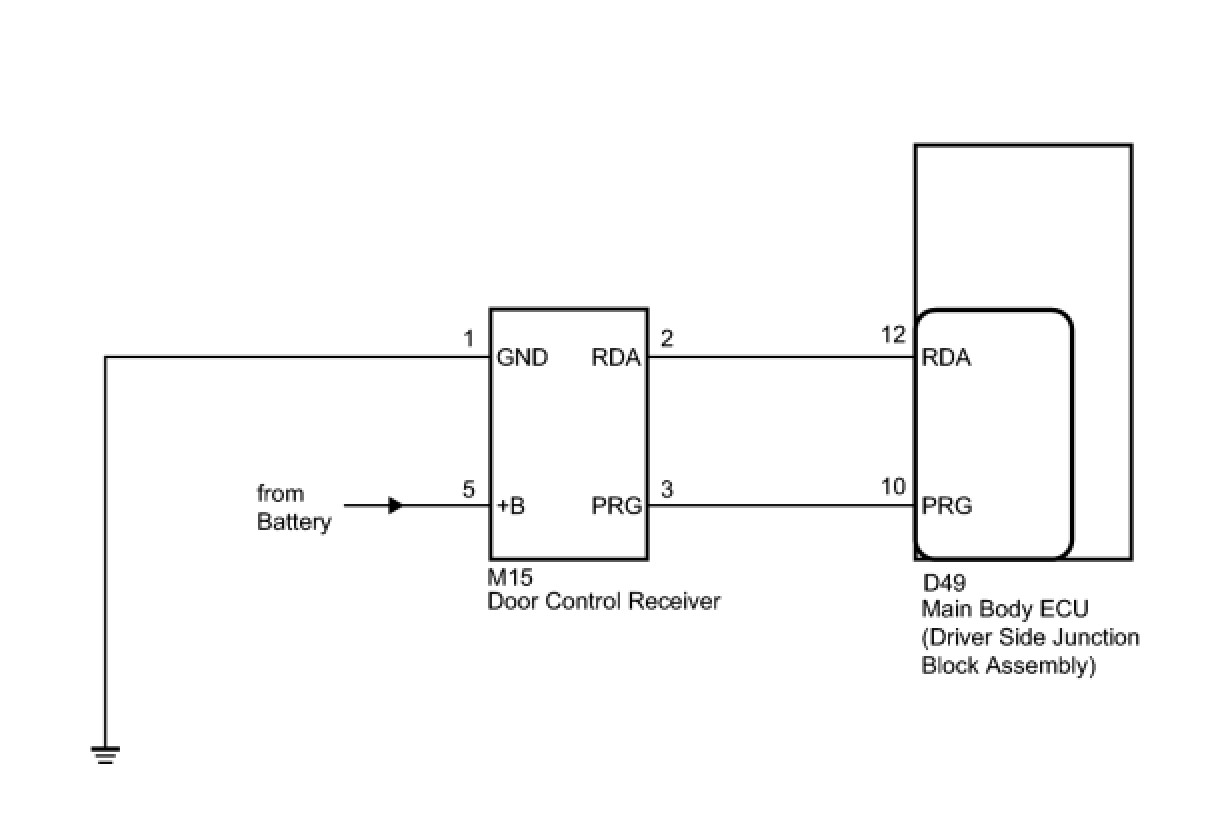 The door control receiver receives signals from the transmitter and sends these signals to the main body ECU (driver side junction block assembly).