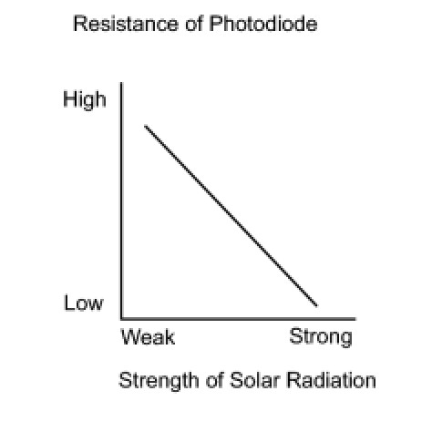 The solar sensor is installed on the upper side of the instrument panel. It detects sunlight to control air conditioning AUTO mode. The output voltage from the solar sensor varies in accordance with the amount of sunlight. When the amount of sunlight increases, the output voltage increases. As the sunlight decreases, the output voltage decreases. The A/C amplifier detects changes in the output voltage from the solar sensor.