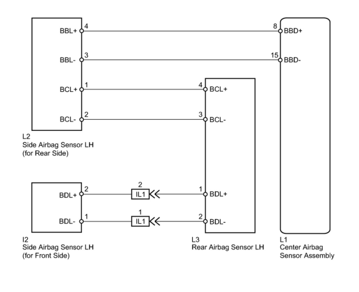 The driver side - side collision sensor circuit (to determine deployment of the front seat side airbag assembly LH and curtain shield airbag assembly LH) is composed of the center airbag sensor assembly, side airbag sensor LH (for rear side), rear airbag sensor LH and side airbag sensor LH (for front side).