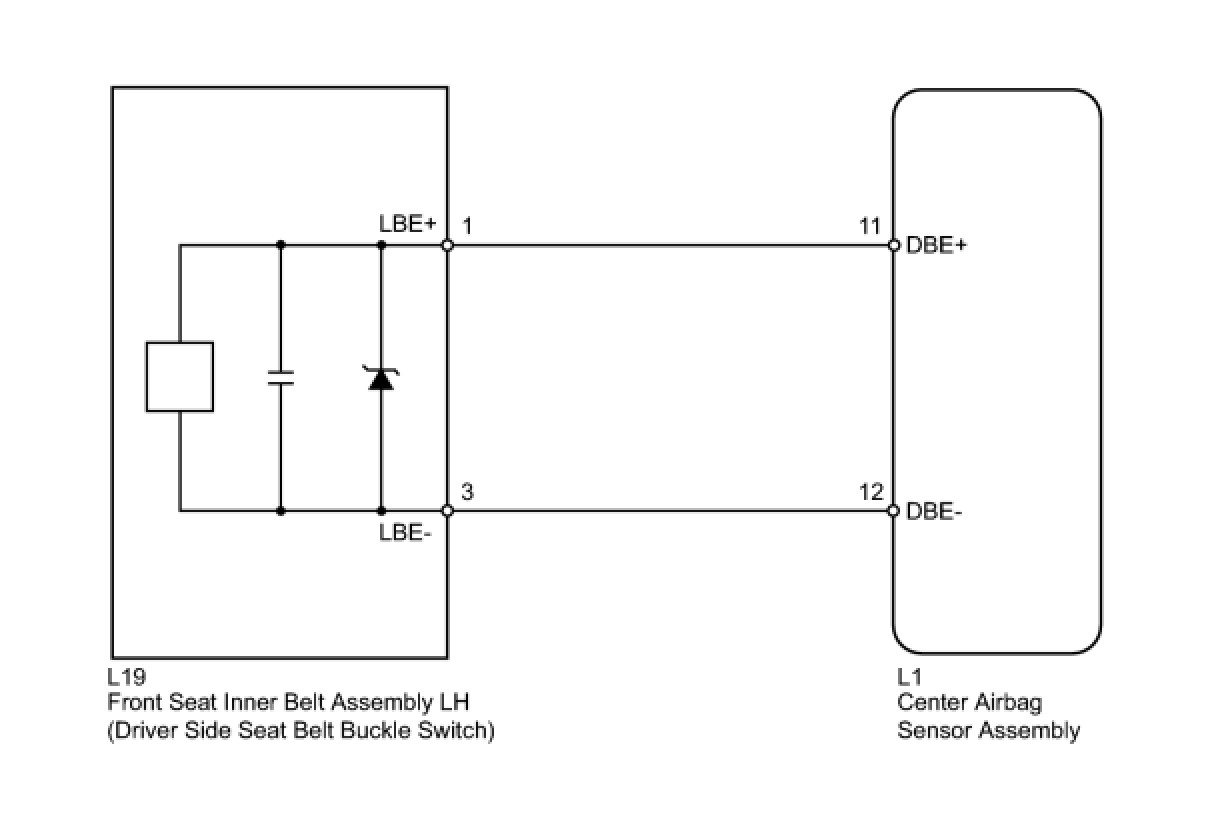 The driver side seat belt buckle switch circuit consists of the center airbag sensor assembly and front seat inner belt assembly LH.