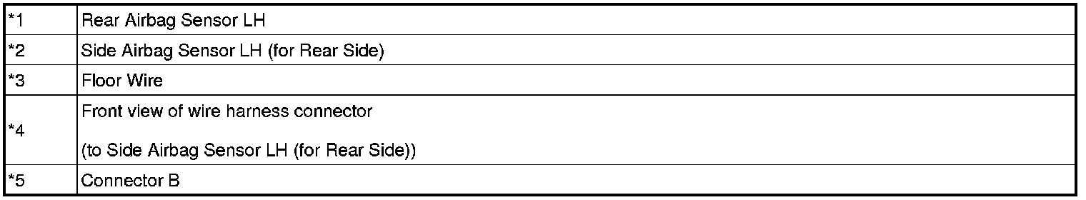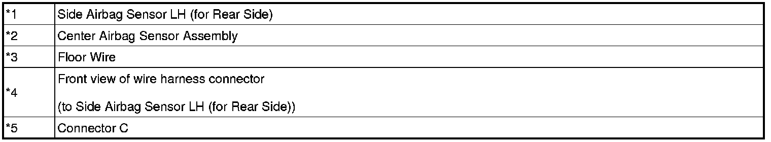 The driver side - side collision sensor circuit (to determine deployment of the front seat side airbag assembly LH and curtain shield airbag assembly LH) is composed of the center airbag sensor assembly, side airbag sensor LH (for rear side), rear airbag sensor LH and side airbag sensor LH (for front side).