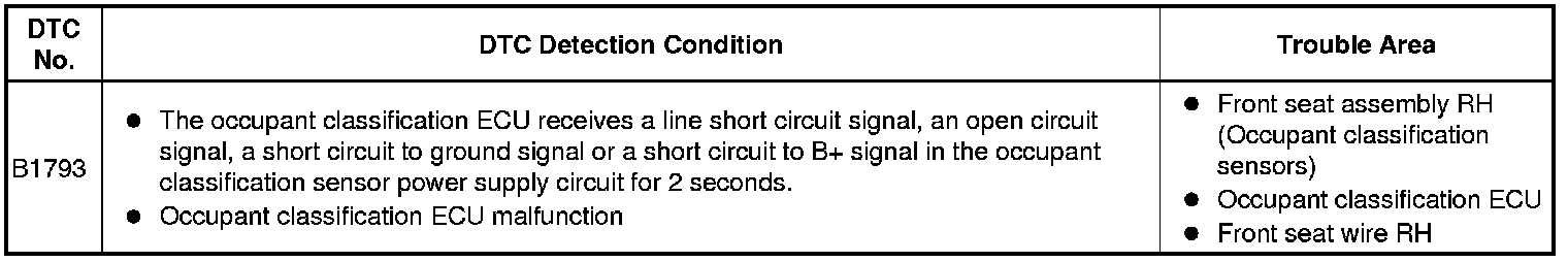 DTC B1793 is recorded when a malfunction is detected in the occupant classification sensor power supply circuit.