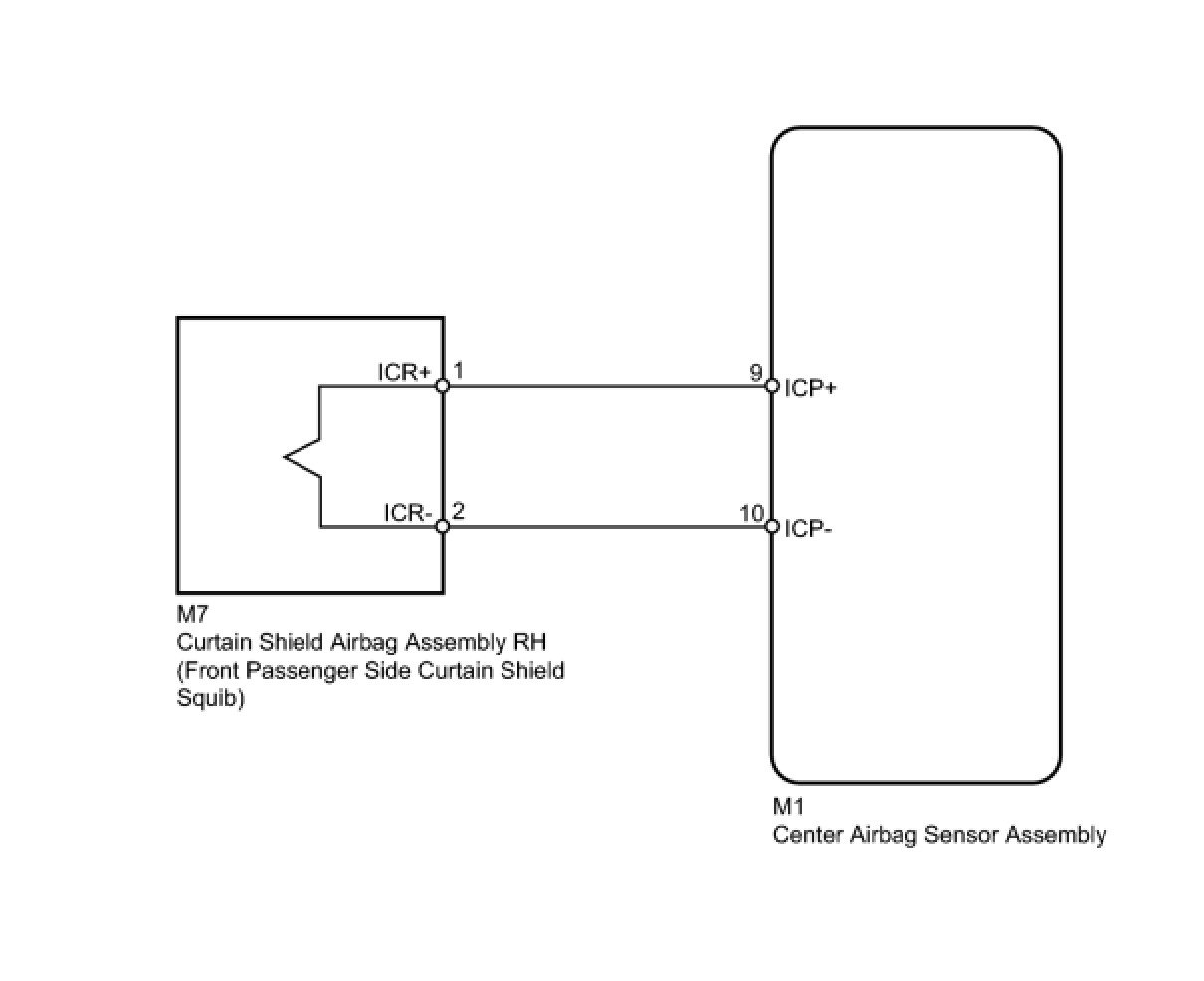 The front passenger side curtain shield squib circuit consists of the center airbag sensor assembly and curtain shield airbag assembly RH.