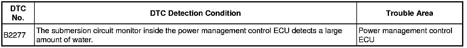 This DTC is stored when the submersion circuit monitor inside the power management control ECU detects a large amount of water.
