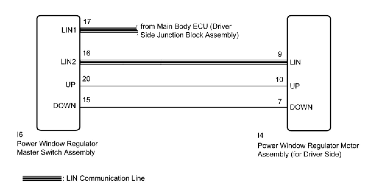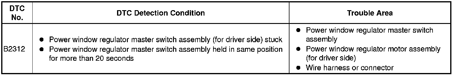 This DTC is output when the ECU built into the regulator motor determines that the power window regulator master switch assembly or power window regulator switch assembly is stuck.