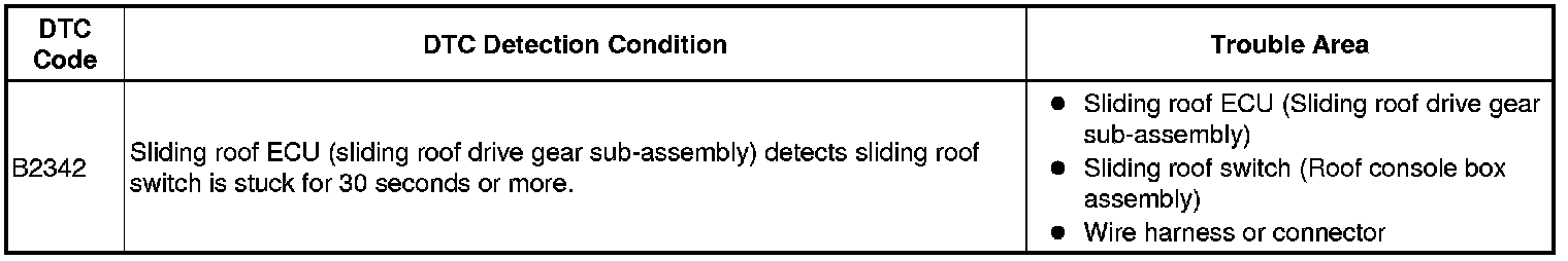 This DTC is output when the sliding roof ECU (sliding roof drive gear sub-assembly) detects that the sliding roof switch is stuck for 30 seconds or more.
