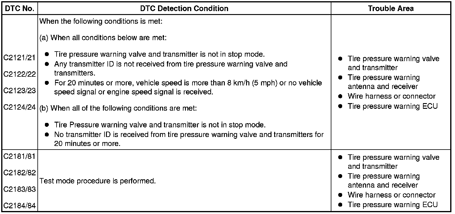 DTCs from C2121/21 to C2124/24 can only be cleared by using the Techstream. DTCs from C2181/81 to C2184/84 can be cleared when the transmitter in the tire pressure warning valve and transmitter sends a forced transmission signal or signal check mode (test mode) ends. DTCs from C2181/81 to C2184/84 are output only in signal check (test mode).