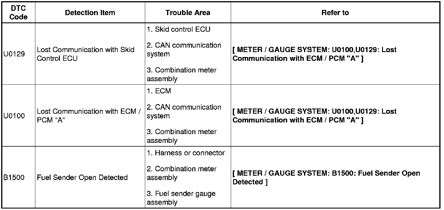 METER / GAUGE / DISPLAY: METER / GAUGE SYSTEM: DIAGNOSTIC TROUBLE CODE CHART