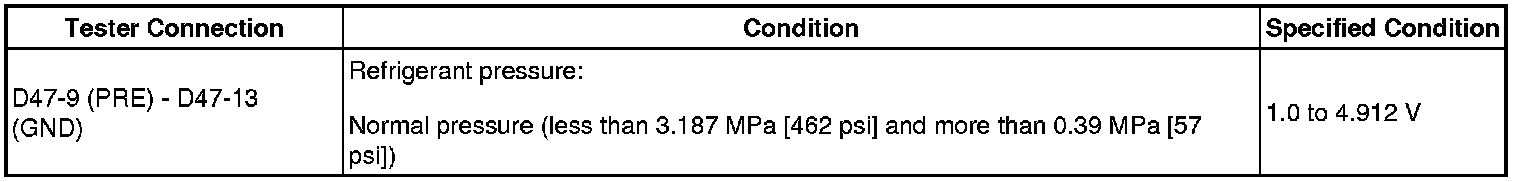 HINT: If the voltage is not as specified, there may be a malfunction in the A/C amplifier, A/C pressure sensor or wire harness. It is also possible that the amount of refrigerant may not be appropriate.