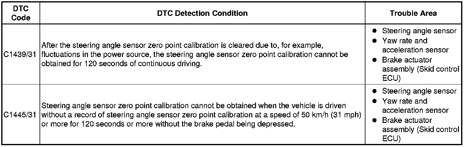 - If the same DTC C1439/31 and/or C1445/31 is not output again, the DTC may have been stored due to a temporary loss of the steering angle zero point calibration, such as when the power source voltage drops.