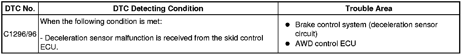 If a malfunction in the deceleration sensor circuit occurs, the AWD control ECU will output this DTC.