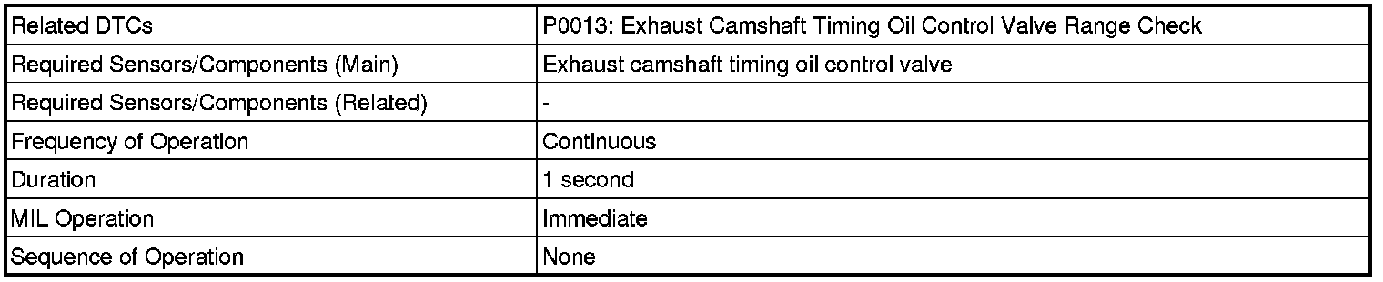 This DTC is designed to detect open or short in the camshaft timing oil control valve (for exhaust camshaft) circuit. If the camshaft timing oil control valve assembly's duty-cycle is excessively high or low while the engine is running, the ECM will illuminate the MIL and set the DTC.