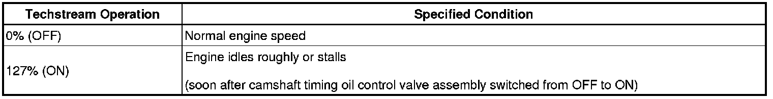 (k) Check the engine speed while operating the camshaft timing oil control valve assembly (for exhaust camshaft) using the Techstream when the engine coolant temperature is 50°C (122°F) or less.