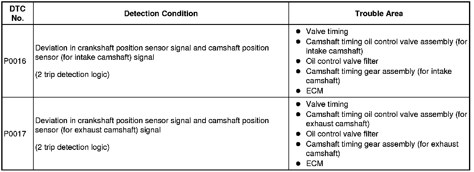 - DTC P0016 or P0017 may be stored when foreign objects in the engine oil are caught in some parts of the system. The DTC will remain set even if the system returns to normal after a short time. Those foreign objects may then be captured by the oil filter.
