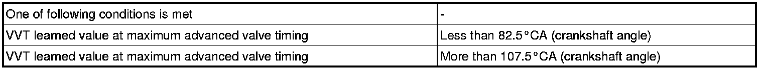 To monitor the correlation of the intake and exhaust camshaft positions and crankshaft position, the ECM checks the VVT learned value while the engine is idling. The VVT learned value is calibrated based on the camshaft positions and crankshaft position. The intake valve timing is set to the most retarded angle while the engine is idling. If the VVT learned value is out of the specified range in consecutive driving cycles, the ECM illuminates the MIL and stores the DTC.