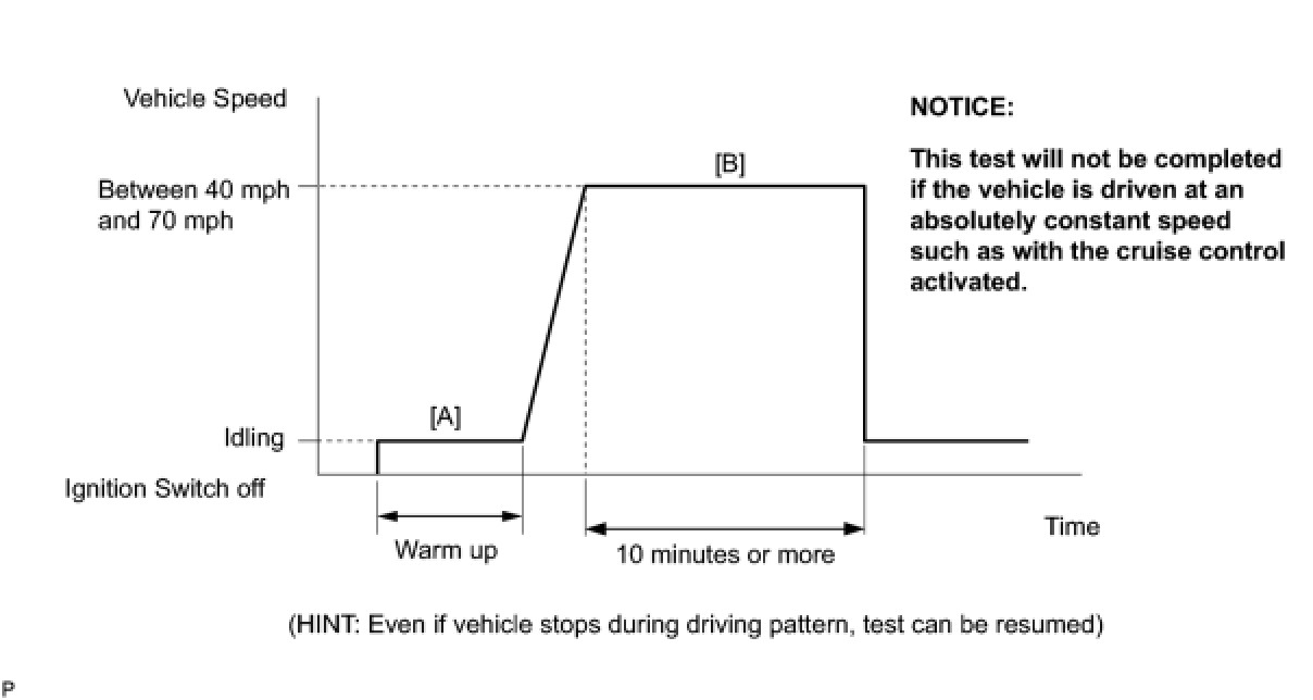 8. Drive the vehicle at between 40 and 70 mph (64 and 113 km/h) for at least 10 minutes or more [B].