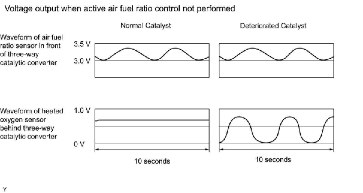 - If the three-way catalytic converter has deteriorated, the heated oxygen sensor (located behind the three-way catalytic converter) voltage output fluctuates up and down frequently, even under normal driving conditions (active air fuel ratio control is not performed).