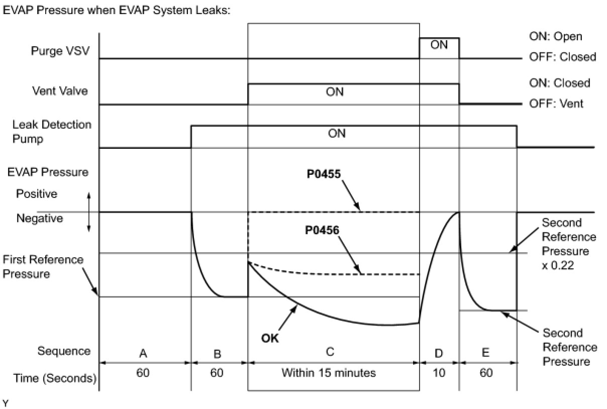 In operation C, the leak detection pump creates negative pressure (vacuum) in the EVAP system and the EVAP system pressure is measured. If the stabilized system pressure is between the second reference pressure and [second reference pressure x 0.22], the ECM determines that the EVAP system has a small leak, illuminates the MIL and stores the DTC (2 trip detection logic).