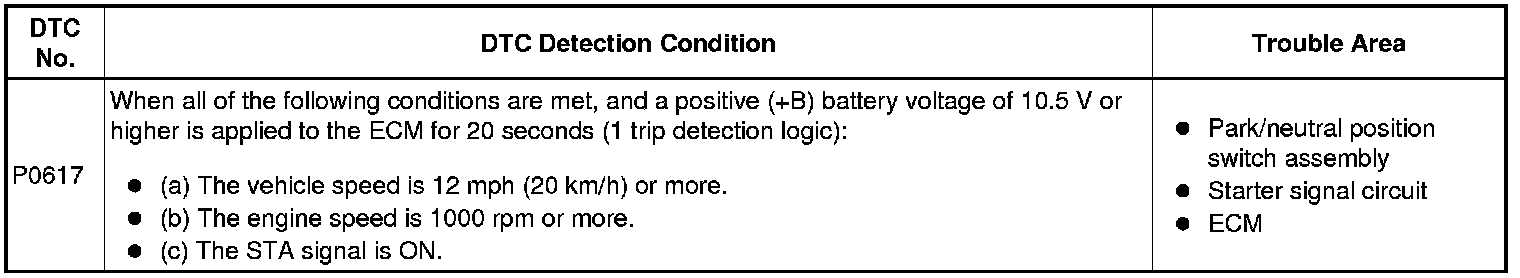 While the engine is being cranked, battery voltage is applied to terminal STA of the ECM. If the ECM detects the Starter Control (STA) signal while the vehicle is being driven, it determines that there is a malfunction in the STA circuit. The ECM then illuminates the MIL and stores the DTC.