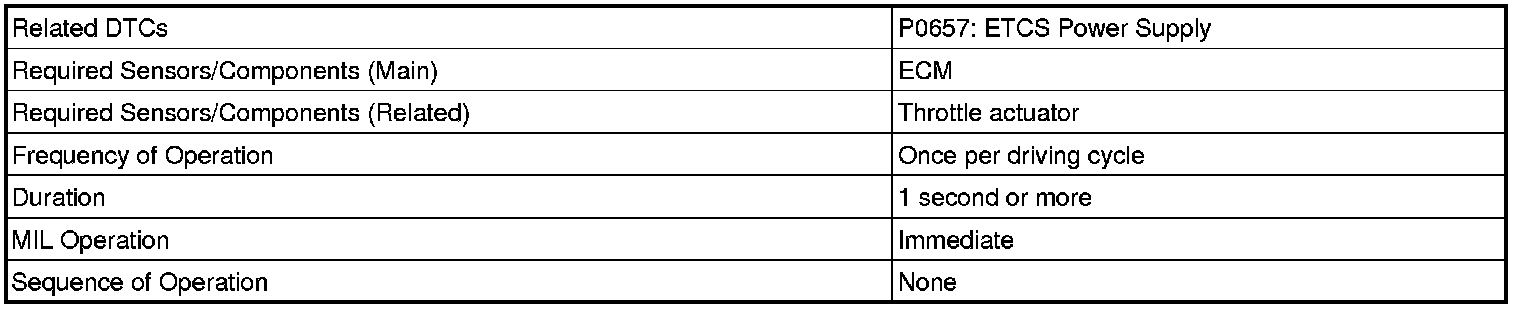 The ECM monitors the output voltage to the throttle actuator. This self-check ensures that the ECM is functioning properly. The output voltage is usually 0 V when the ignition switch is turned off. If the output voltage is higher than 7 V when the ignition switch is turned off, the ECM illuminates the MIL and stores the DTC when the ignition switch is turned to ON.