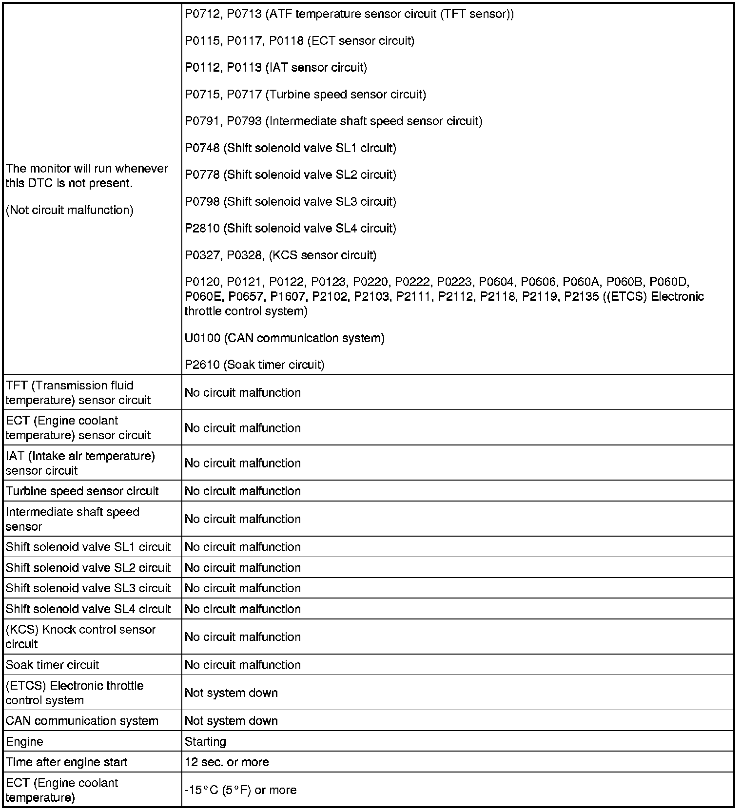 HINT: If a circuit related to the ATF temperature sensor becomes open, P0713 is immediately set (in 0.5 seconds). When P0713 is set, P0711 cannot be detected.