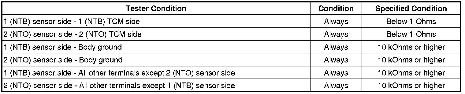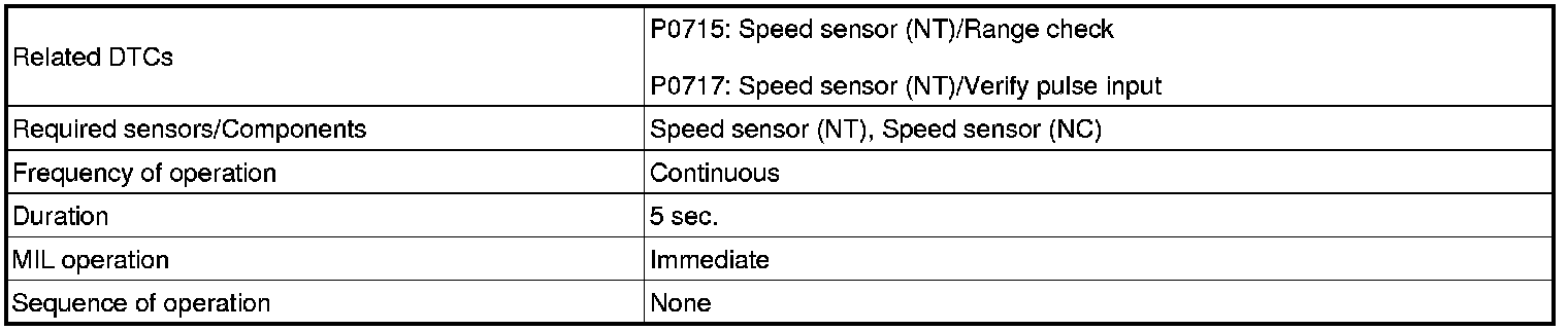 The NT terminal of the TCM detects a revolution signal from the speed sensor (NT) (input RPM). The TCM calculates gear shifts comparing the speed sensor (NT) with the speed sensor (NC).
