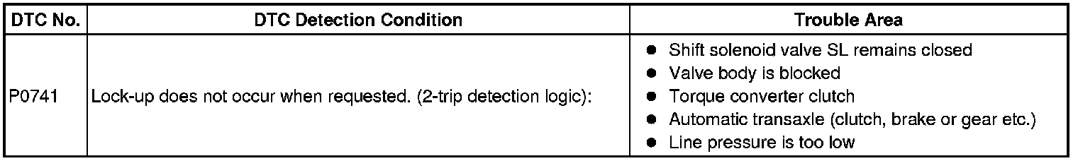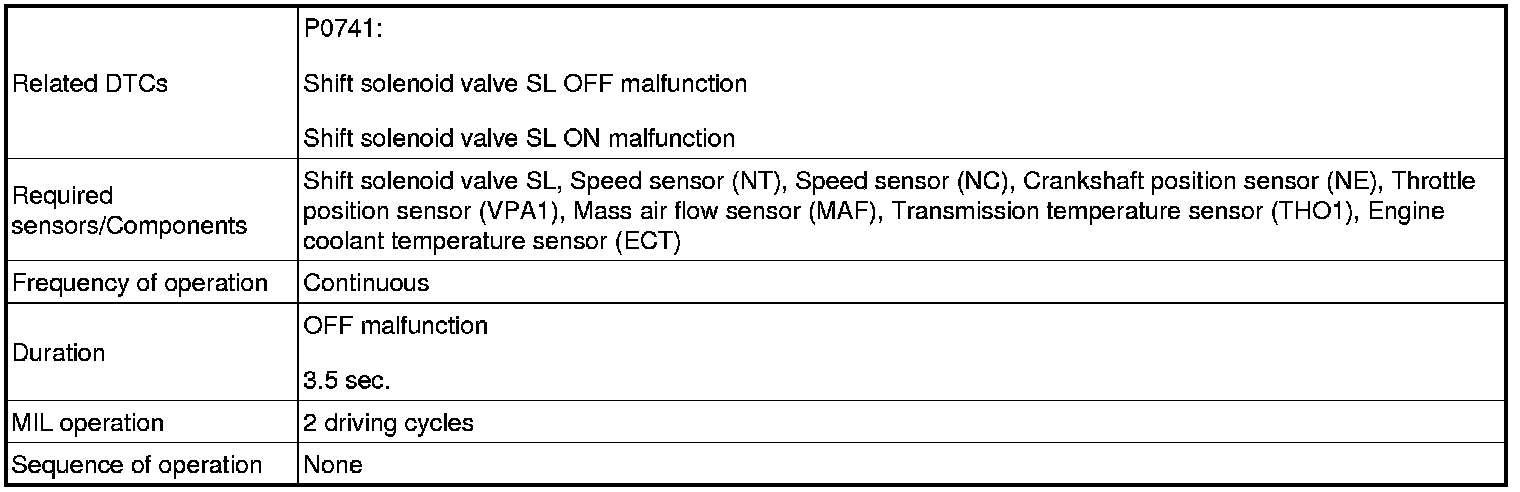 If the TCM detects no lock-up after lock-up has been requested or if it detects lock-up when it is not requested, the TCM interprets this as a fault in shift solenoid valve SL or lock-up system performance. The TCM will turn on the MIL and store the DTC.