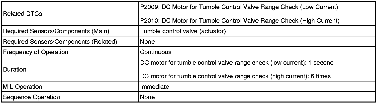 The ECM activates the DC motor for the tumble control valve, which opens and closes the tumble control valve. The ECM activates the DC motor based on engine speed, coolant temperature, intake air temperature and other conditions.
