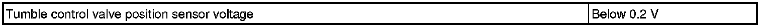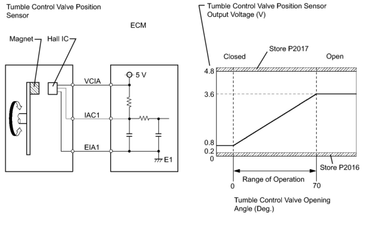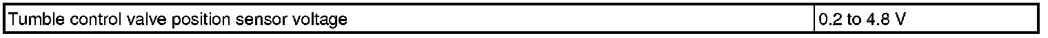 The ECM IAC1 terminal voltage increases in correlation with the opening angle of the tumble control valve. When the tumble control valve is fully closed, approximately 0.8 V is applied to the IAC1 terminal. When the tumble control valve is fully open, approximately 3.6 V is applied to the IAC1 terminal.