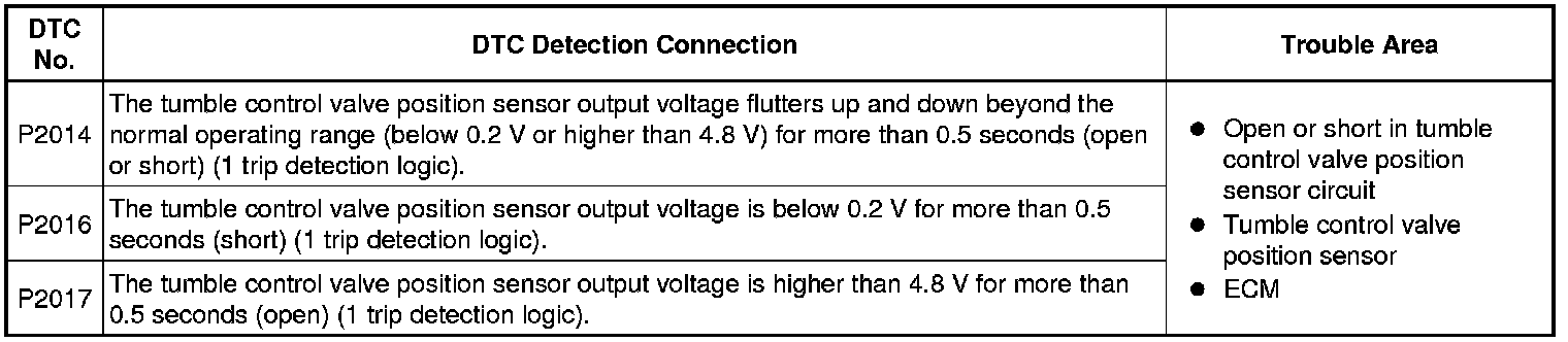 HINT: After confirming DTC P2014, P2016 or P2017, use the Techstream to confirm the IAC Sensor Voltage (tumble control valve position sensor output voltage). Enter the following menus: Powertrain / Engine / Data List / All Data / IAC Sensor Voltage.