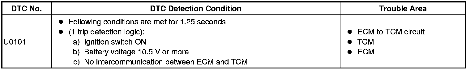 The Transmission Control Module (TCM) and ECM perform 2-way communication with each other via the Controller Area Network (CAN). The TCM sends signals to the ECM concerning required engine speed, required engine torque, warning indicators in the combination meter, DTCs and other data. The ECM sends signals to the TCM concerning engine speed, opening angle of the throttle valve, temperature of intake air, temperature of engine coolant, engine torque and other data. If the TCM cannot communicate with the ECM, the TCM will conclude that there is a malfunction in the CAN system, illuminate the MIL and set a DTC.