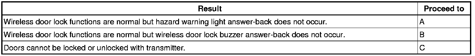 In some cases, wireless door lock control functions are normal but the hazard warning light and/or wireless door lock buzzer answer-back function(s) does not operate. In such cases, the main body ECU (driver side junction block assembly) hazard warning light and wireless door lock buzzer signal outputs may be malfunctioning.