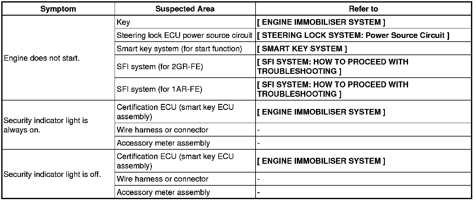 THEFT DETERRENT / KEYLESS ENTRY: ENGINE Immobilizer SYSTEM (w/ Smart Key System): PROBLEM SYMPTOMS TABLE