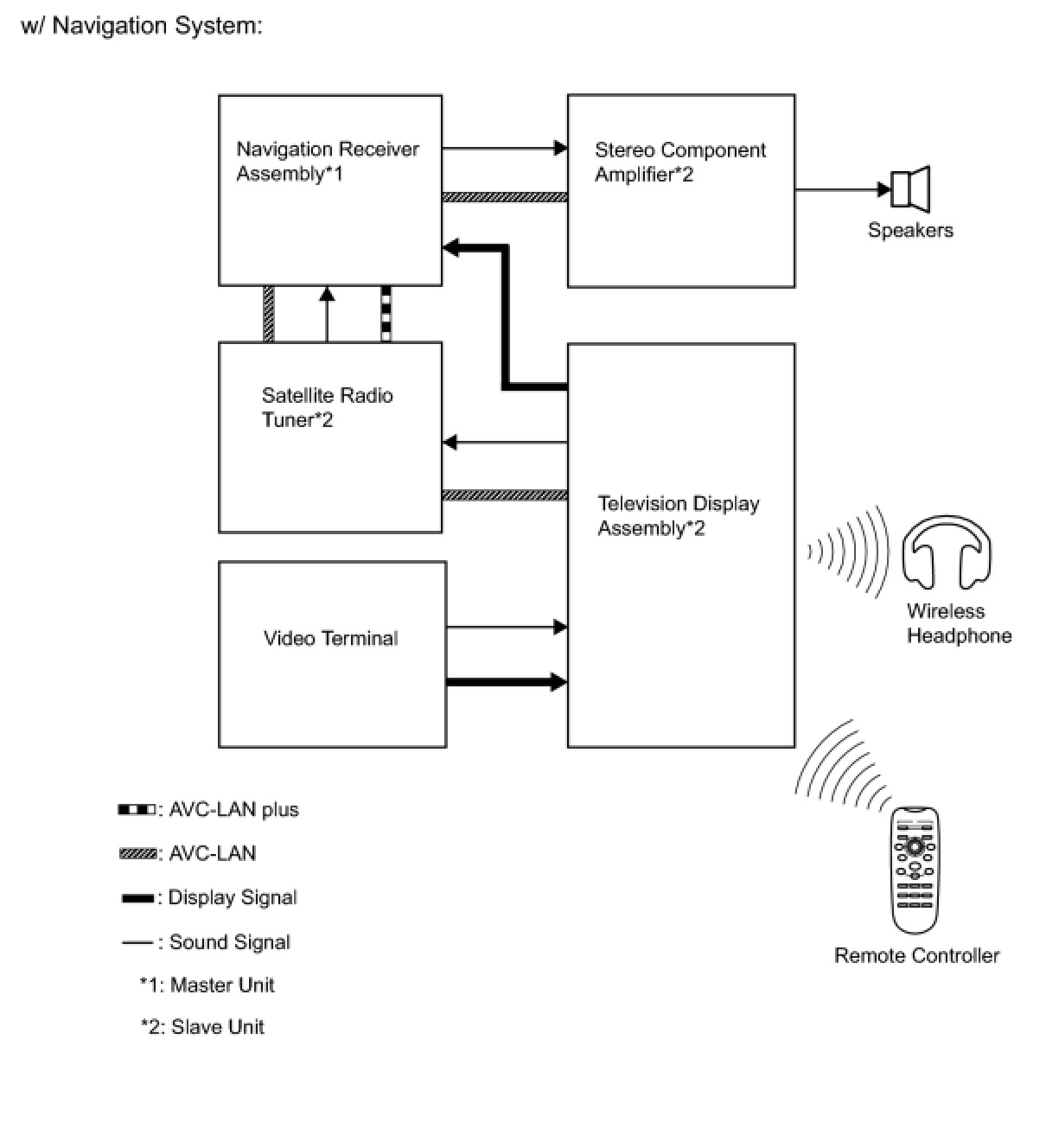 - The RSE system is controlled by the television display, and the communication between the audio head unit*1, navigation head unit*2 and the television display is established via an Audio Visual Communication-Local Area Network (AVC-LAN).