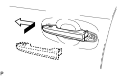 (b) Insert the rear end of the front door outside handle assembly into the front door outside handle frame, then slide the front door outside handle assembly toward the front of the vehicle to install it.