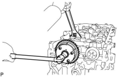 (d) Using a wrench to hold the hexagonal portion of the No. 1 camshaft, install the bolt.