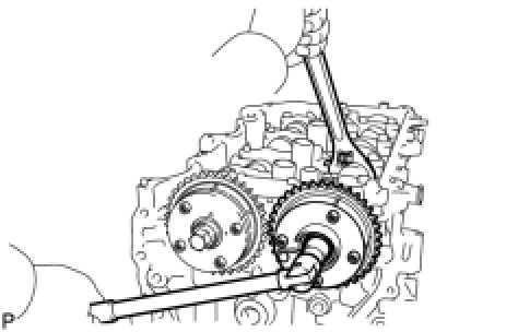 (c) Using a wrench to hold the hexagonal portion of the No. 2 camshaft, install the bolt.