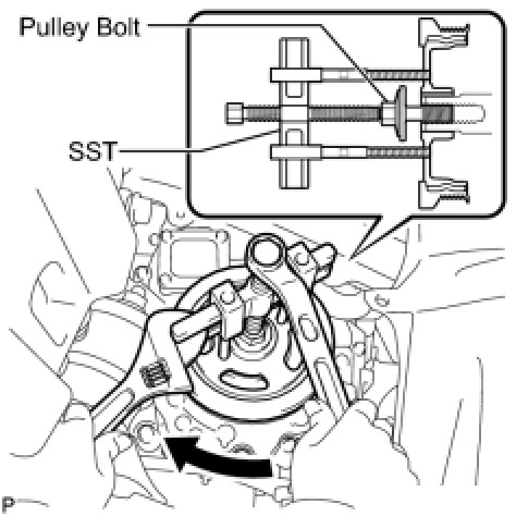 (b) Using SST and the pulley bolt, remove the crankshaft pulley.