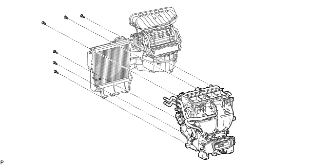 (a) Remove the 6 screws and air conditioning radiator assembly from the blower assembly with evaporator sub-assembly.