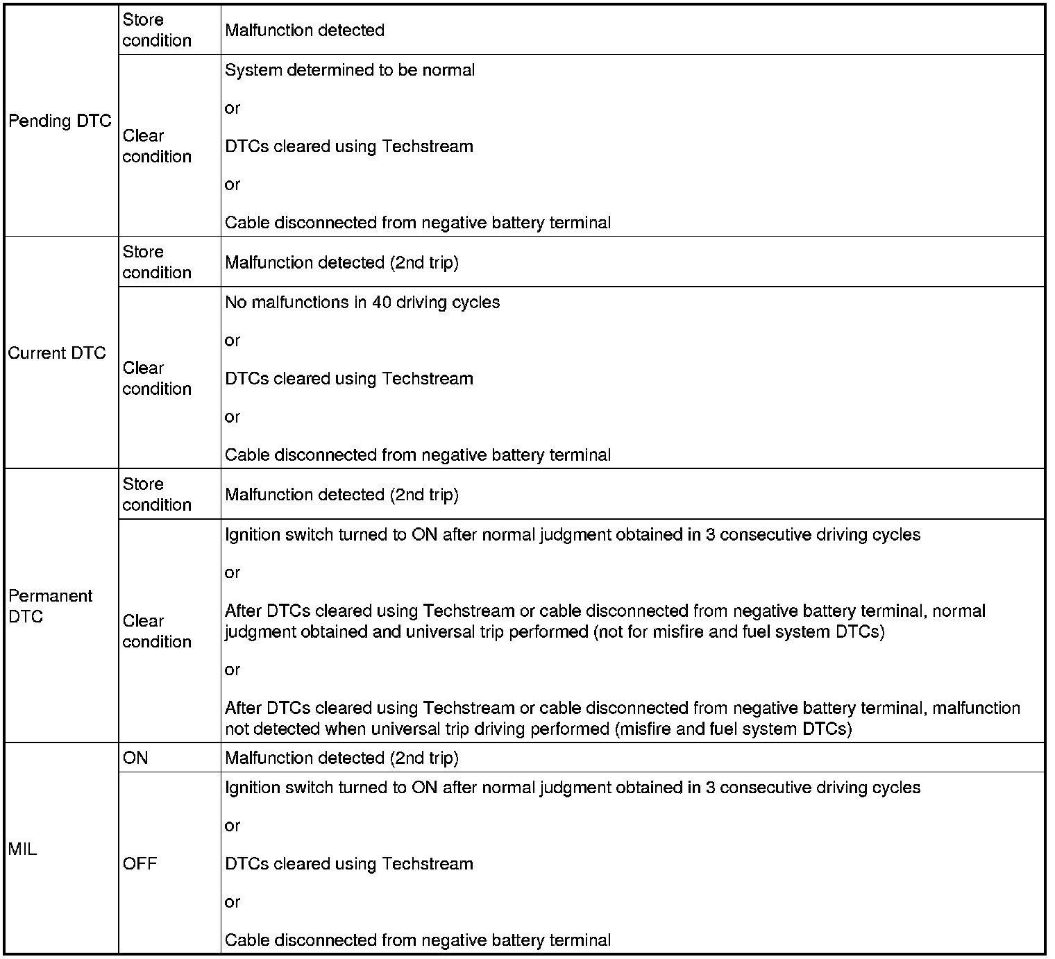 - Current and pending DTCs can be cleared by using the Techstream or by disconnecting the cable from the negative battery terminal. However, permanent DTCs cannot be cleared using either of these two methods.
