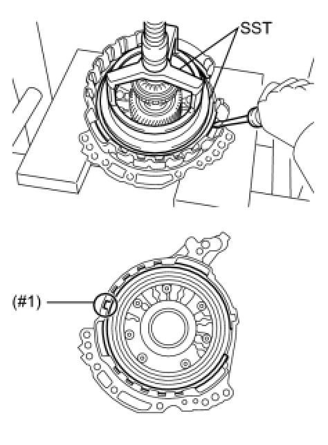 - Make sure to align the protruding part of the snap ring with the indented part (#1) of the front oil pump and gear body assembly shown in the illustration to install the snap ring.