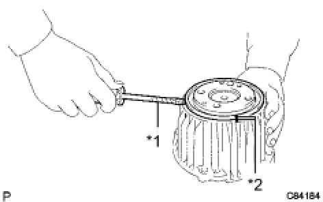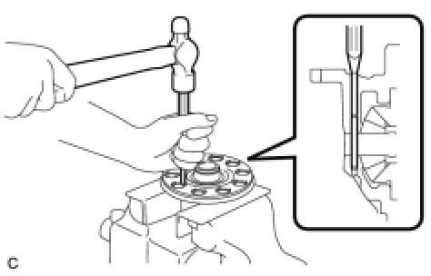 (a) Using a brass bar and a hammer, lightly and uniformly tap out the rear drive pinion rear tapered roller bearing (outer race) from the rear differential carrier.