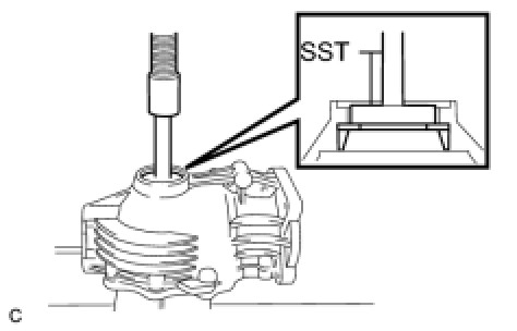 (a) Using SST, remove the rear drive pinion front tapered roller bearing (outer race) from the rear differential carrier.