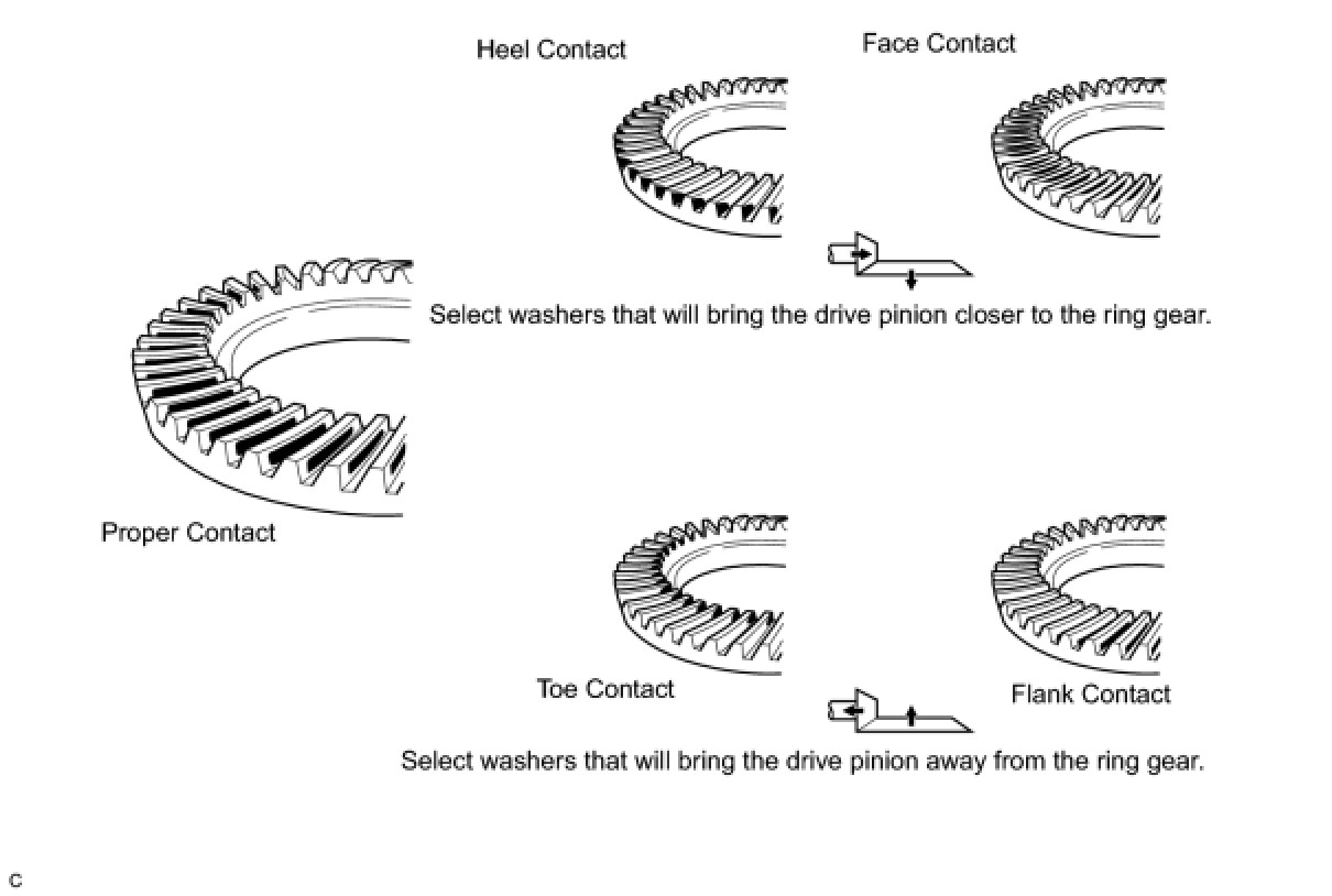 HINT: If the tooth contact pattern is not correct, reselect rear differential side gear shaft plate washers and reinspect the tooth contact pattern.