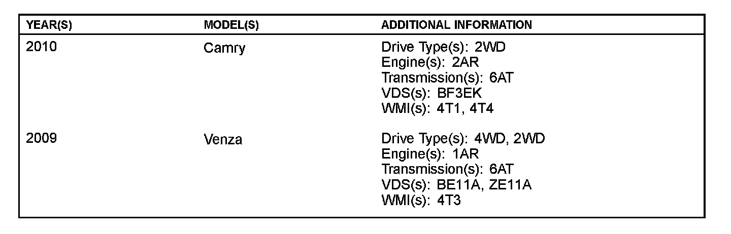 Some 2009 model year Venza and 2010 model year Camry vehicles may display a transaxle fluid leak from a missing transaxle case plug on the upper right hand side of the transaxle case. Production improvements have been implemented to prevent this from occurring. Follow the repair procedure below to install the missing transaxle case plug.