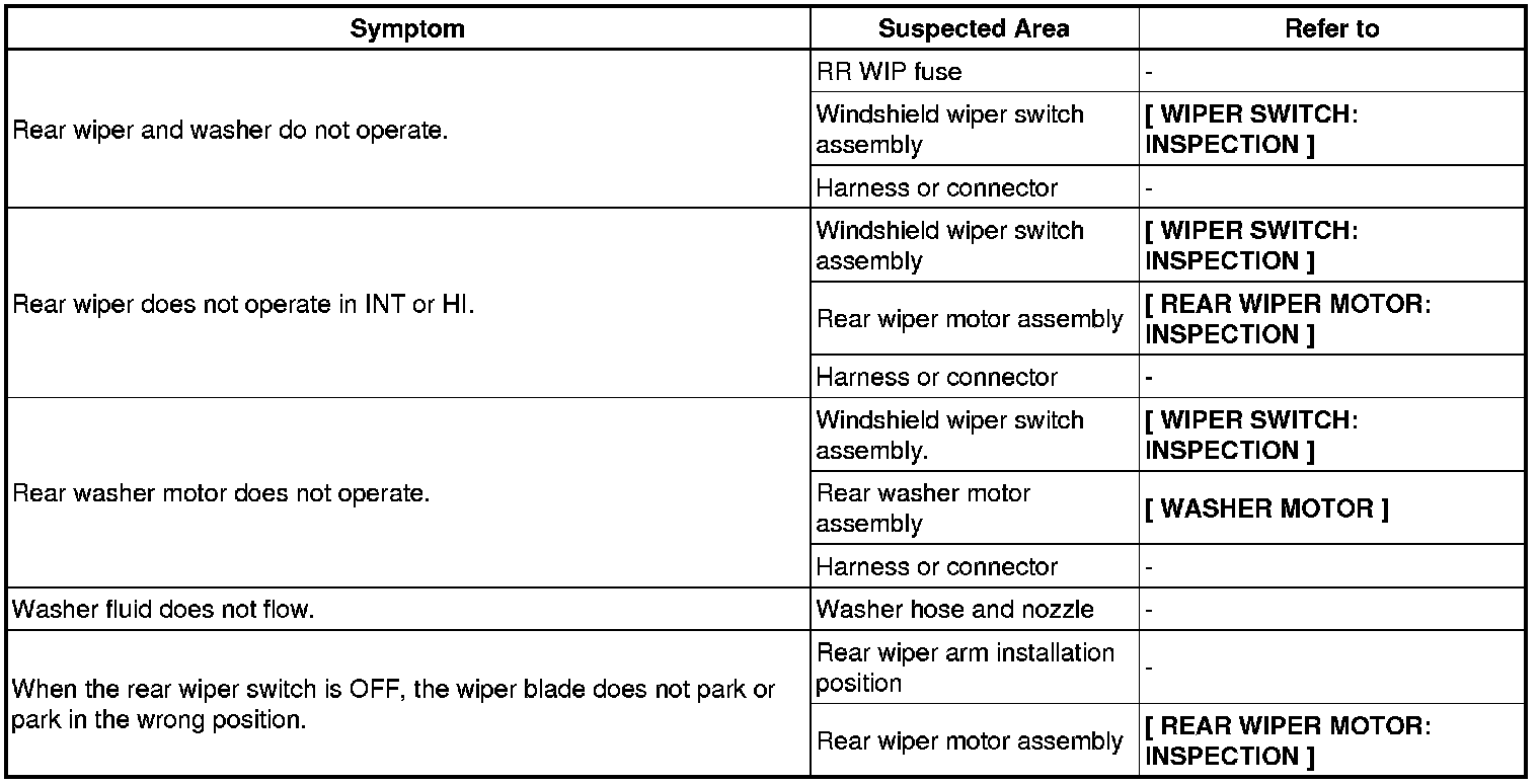 WIPER / WASHER: WIPER AND WASHER SYSTEM: PROBLEM SYMPTOMS TABLE